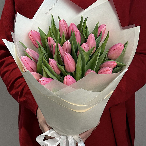 Букет из 21 розового тюльпана (Голландия) в матовой упаковке