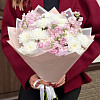 Букет из белой хризантемы и розовой маттиолы в фирменной упаковке