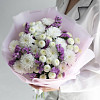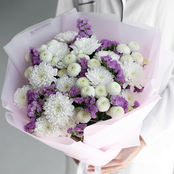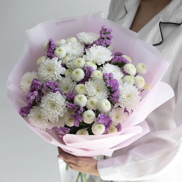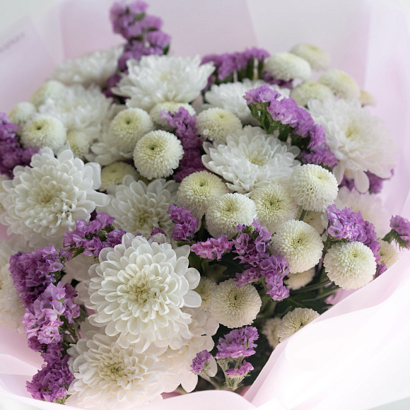 Букет из кустовых хризантем с розовой статицей в фирменной упаковке